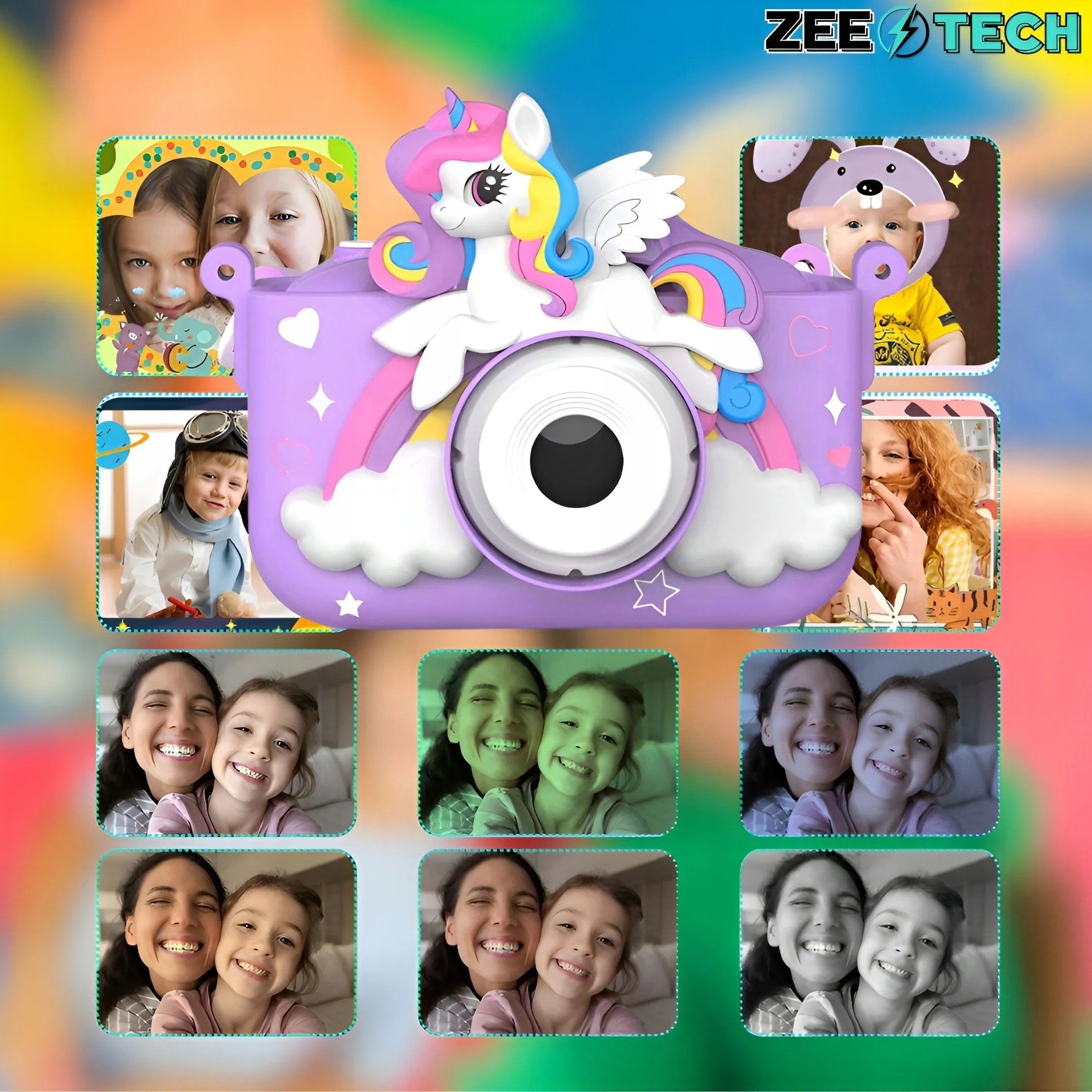 Cyfrowy mini aparat dla dzieci oferuje rozmaite funkcje, takie jak kolorowe filtry do zdjęć i mnóstwo foto ramek. Pociechy mogą z łatwością wybrać tło i ramkę do zdjęcia na aparacie i uwieczniać unikatowe chwile.