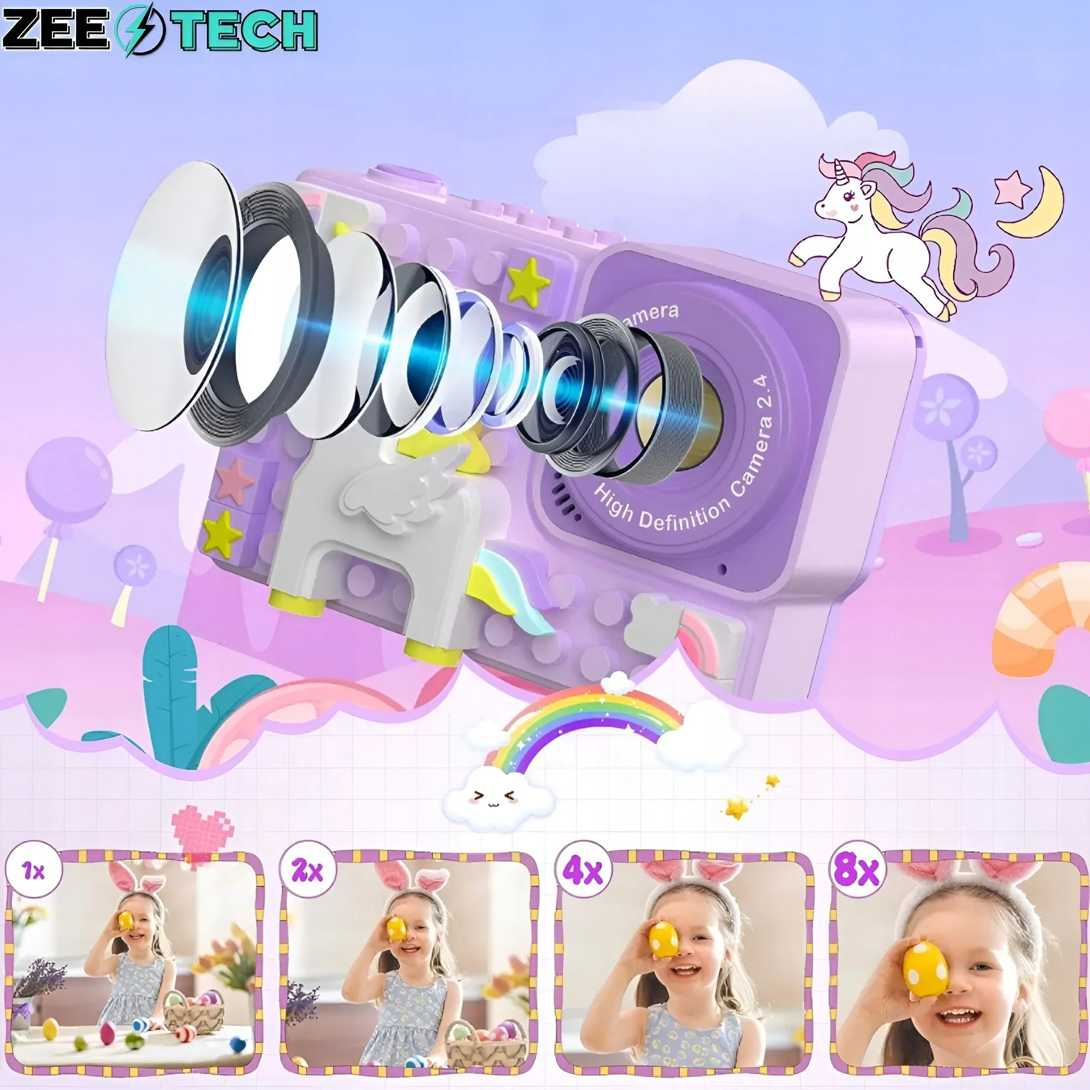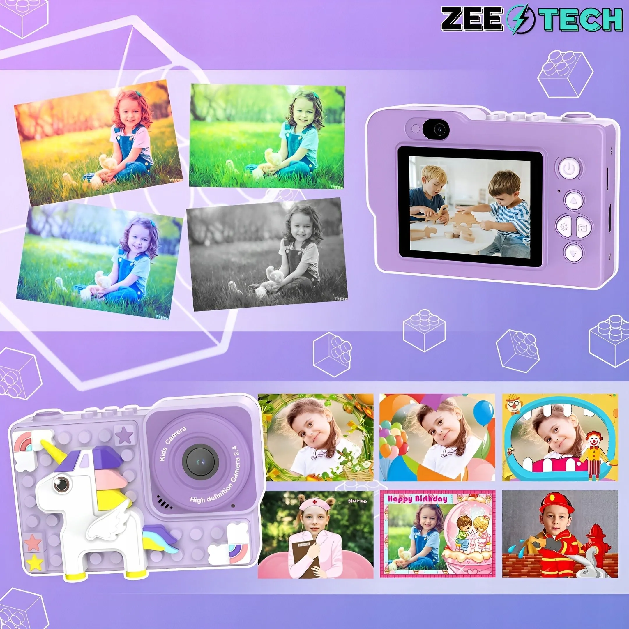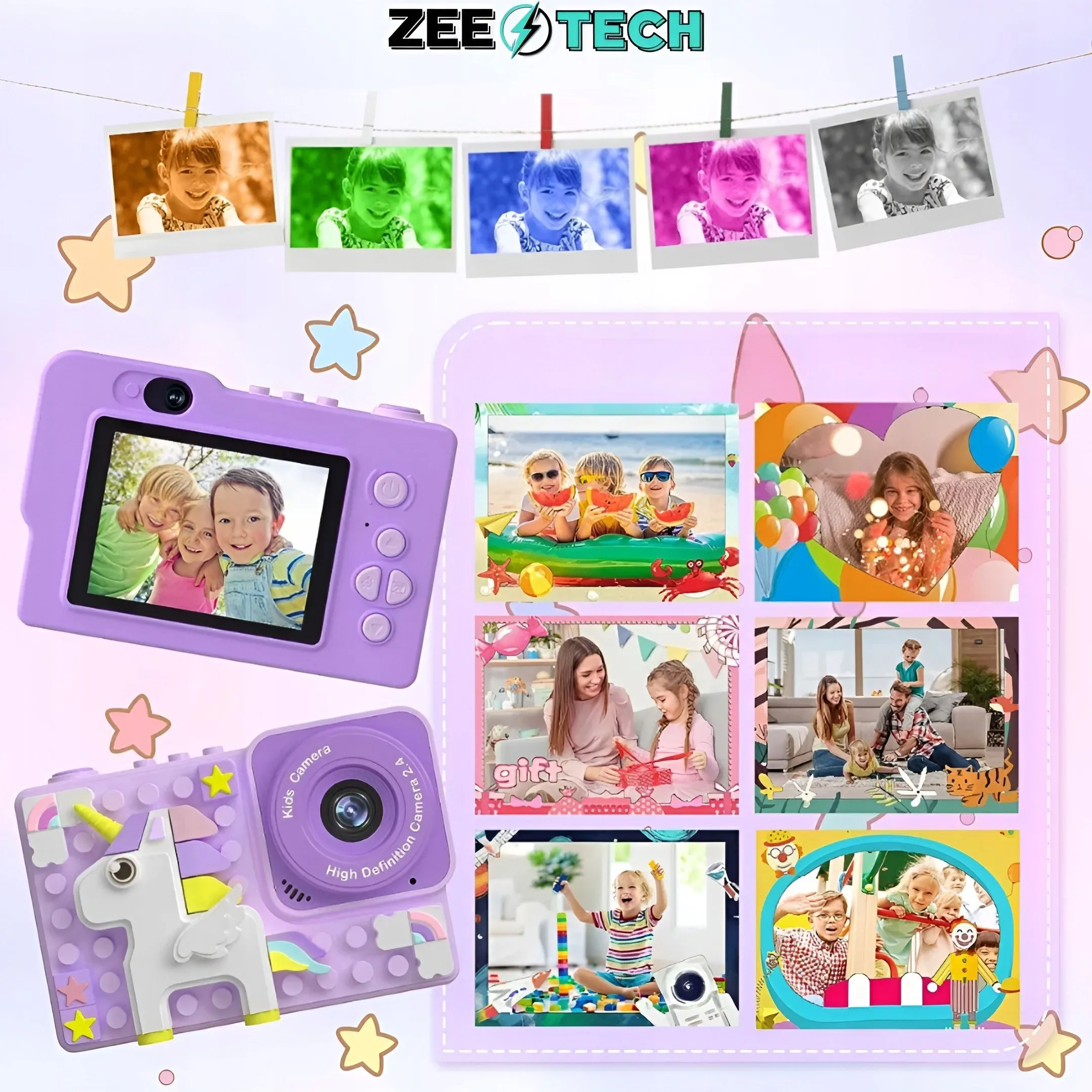 Cyfrowy mini aparat dla dzieci oferuje rozmaite funkcje, takie jak kolorowe filtry do zdjęć i mnóstwo foto ramek. Pociechy mogą z łatwością wybrać tło i ramkę do zdjęcia na aparacie i uwieczniać unikatowe chwile.