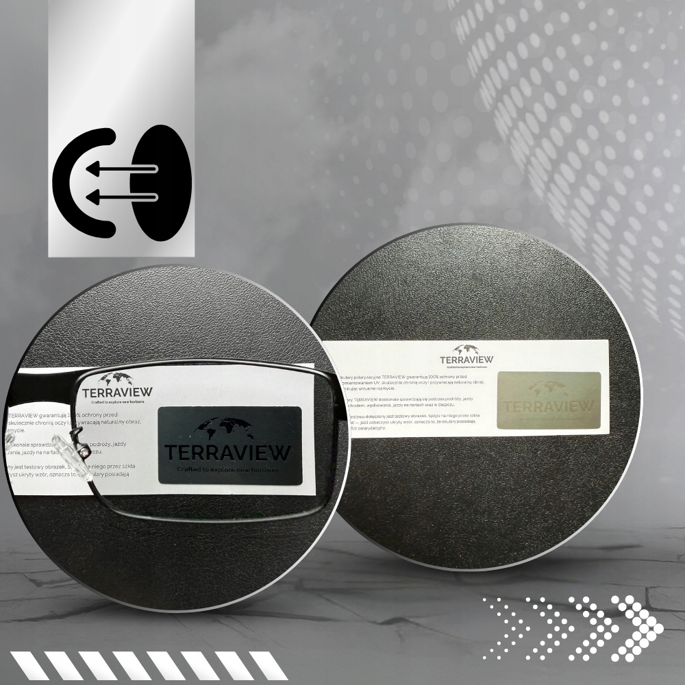 Dołączony do zestawu tester polaryzacji Terraview pozwala szybko i łatwo sprawdzić skuteczność filtra w okularach przeciwsłonecznych. Na specjalnej karcie testowej znajduje się logo Terraview – widoczne delikatnie gołym okiem, ale wyraźne i kontrastowe dopiero przez szkła z polaryzacją.