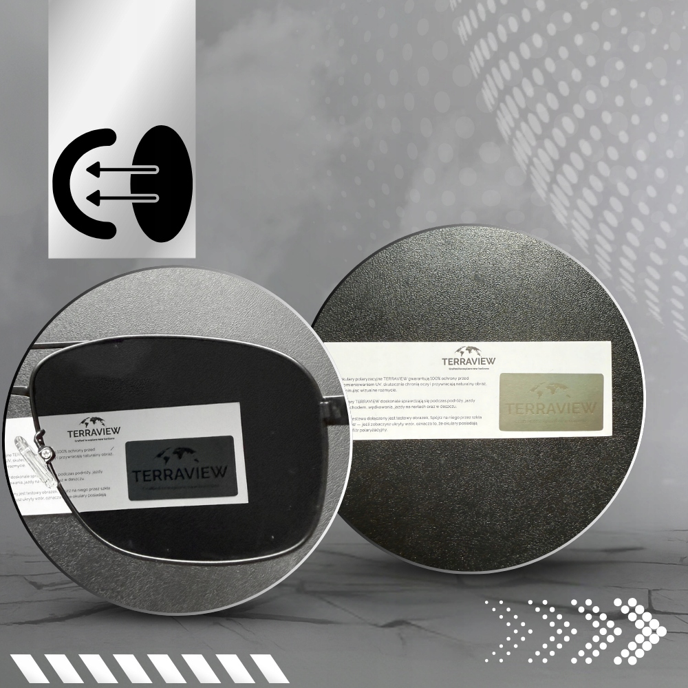 Dołączony do zestawu tester polaryzacji Terraview pozwala szybko i łatwo sprawdzić skuteczność filtra w okularach przeciwsłonecznych. Na specjalnej karcie testowej znajduje się logo Terraview – widoczne delikatnie gołym okiem, ale wyraźne i kontrastowe dopiero przez szkła z polaryzacją.